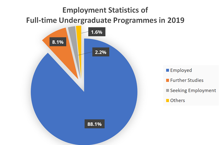 Our programmes equip students with professional and subject knowledge under the framework of Graduate Attributes “PEER & I” that are relevant to their future roles and highly regarded by employers. In 2019, the average monthly salary was HK$27,136, well above the average monthly salary of graduates in the territory.
